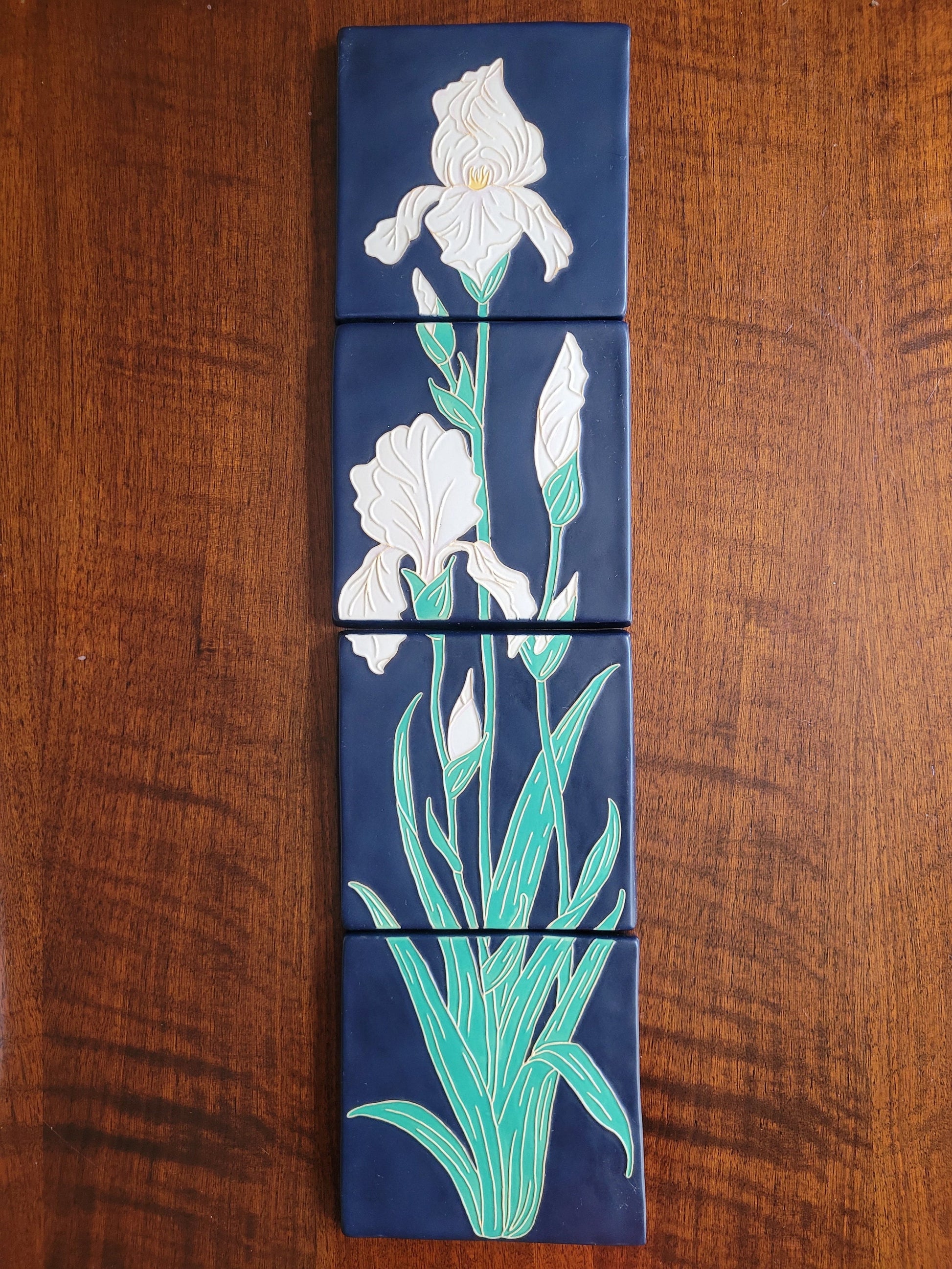 This Art Nouveau Iris tile is handmade by pressing a block of clay into a hand carved mold, and glazing with a bulb syringe using a variety of commercial glazes. The tile itself is roughly 5” by 5”, and the overall size when hung is 20”x5”. This gorgeous piece is ideal to be hung on the wall either framed or as a stand alone piece.