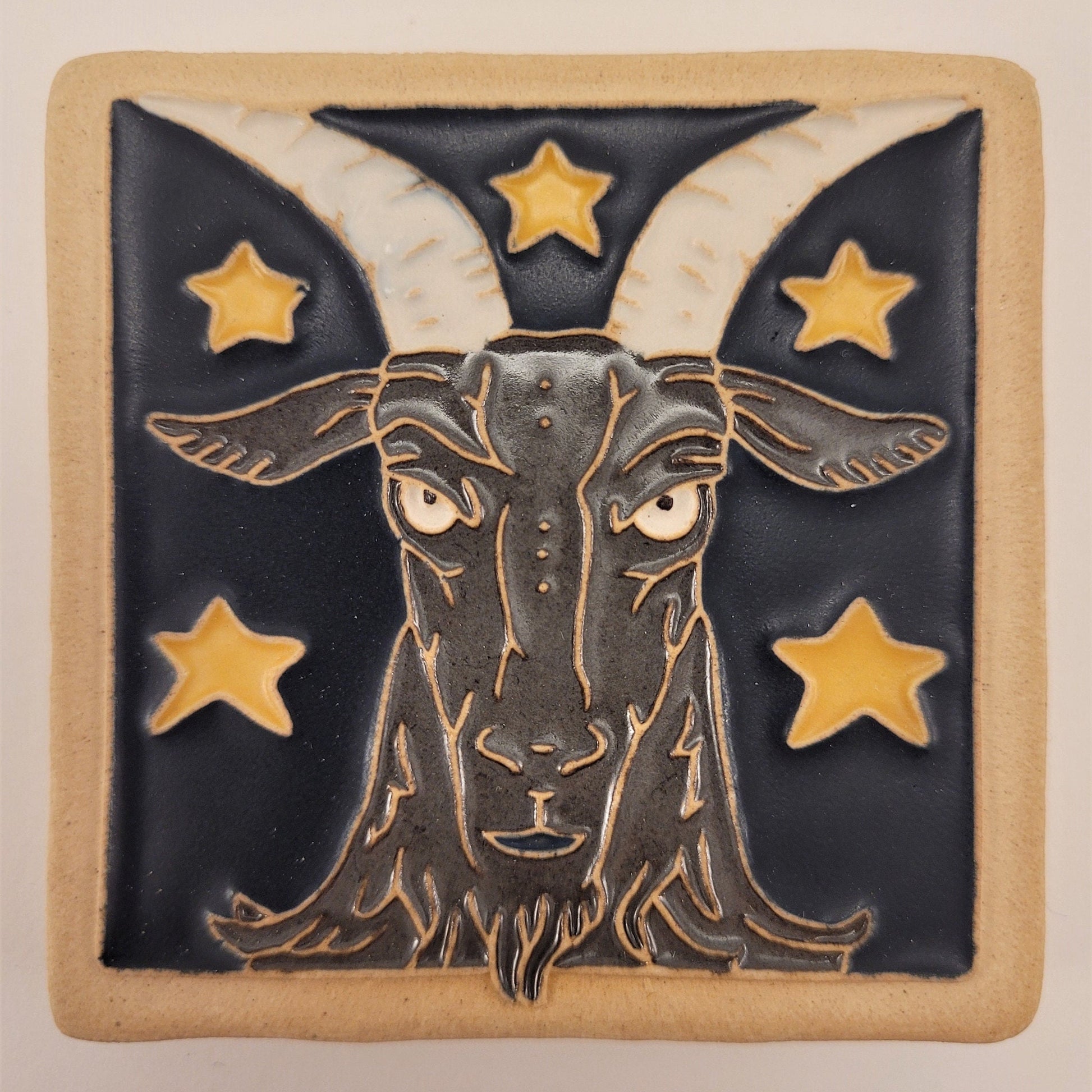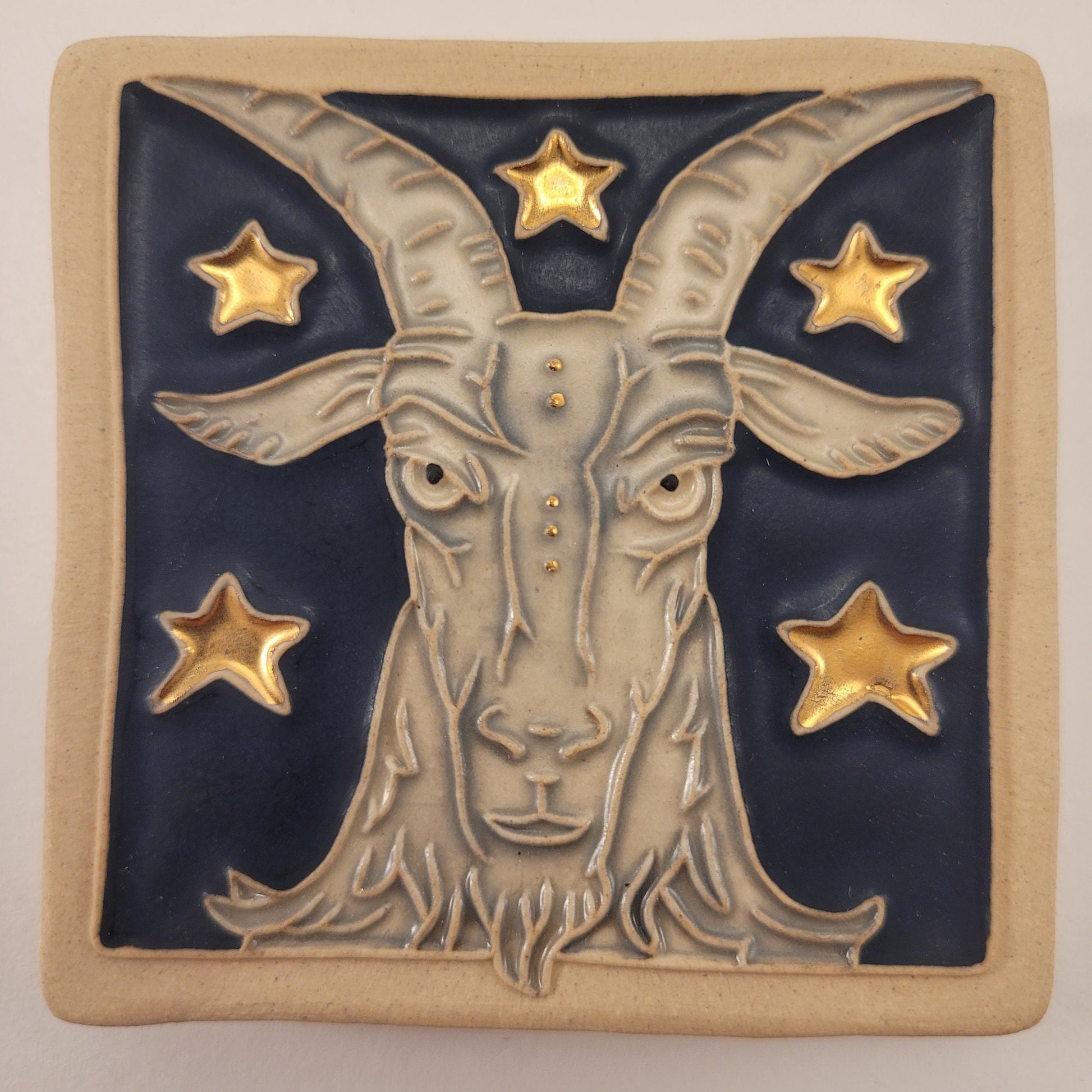 Capricorn - This astrology tile is a hand made ceramic tile. The size is roughly 3"x3" and is perfect for being displayed on a wall, or in a custom frame. Each ceramic tile is pressed into an original hand carved mold, and then glazed in a variety of commercial glazes.