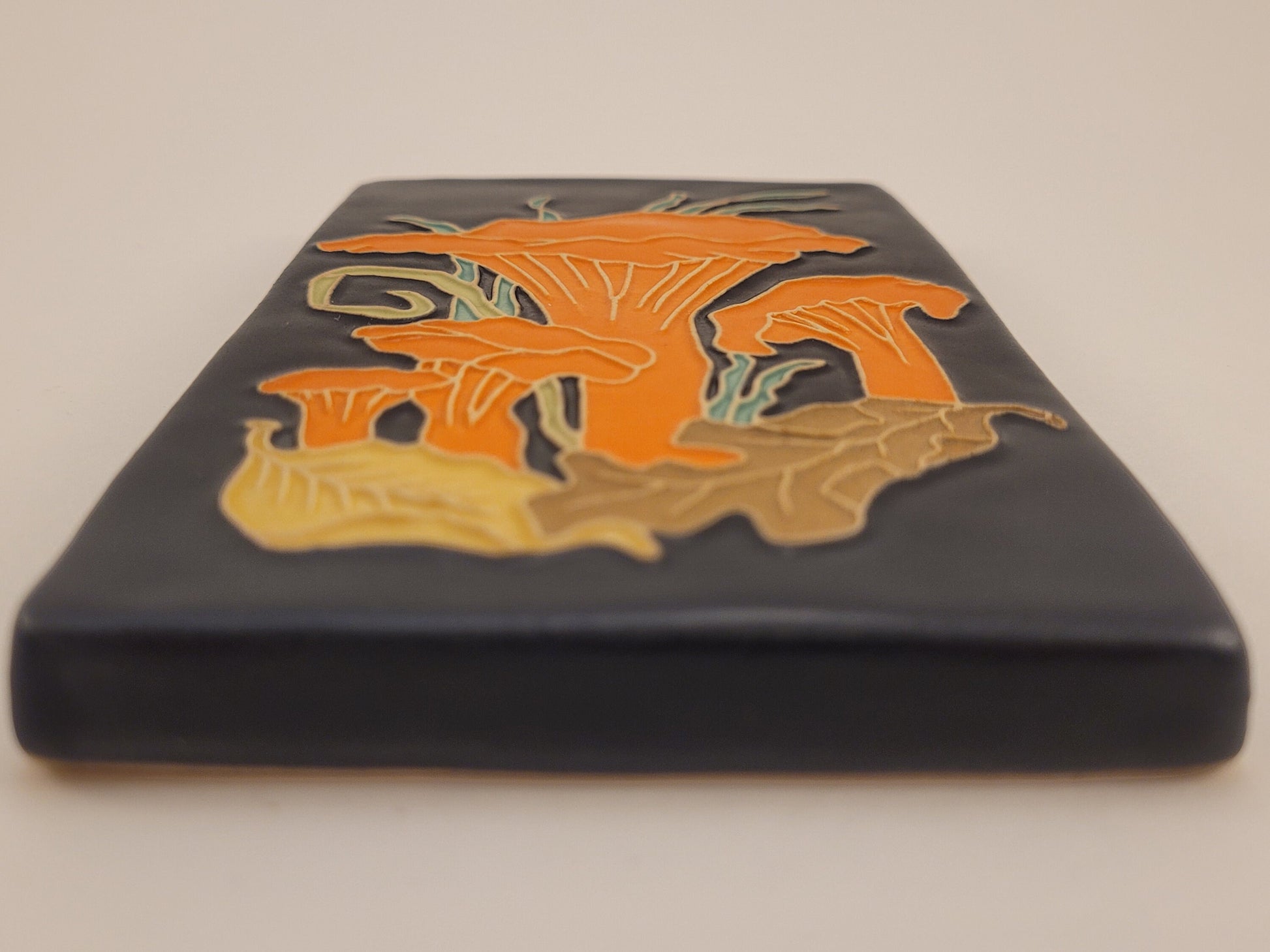 This Chanterelle Mushroom ceramic art tile is one of my favorite pieces! The vibrant orange color is just like the real mushrooms, and the size is great for hanging on a wall, displaying on a small stand, or framing. Each tile is pressed into an original hand carved mold, then glazed with a variety of commercial glazes. Plus, I love the taste of chanterelle mushrooms! This tile is about 5.25" x 3.25".