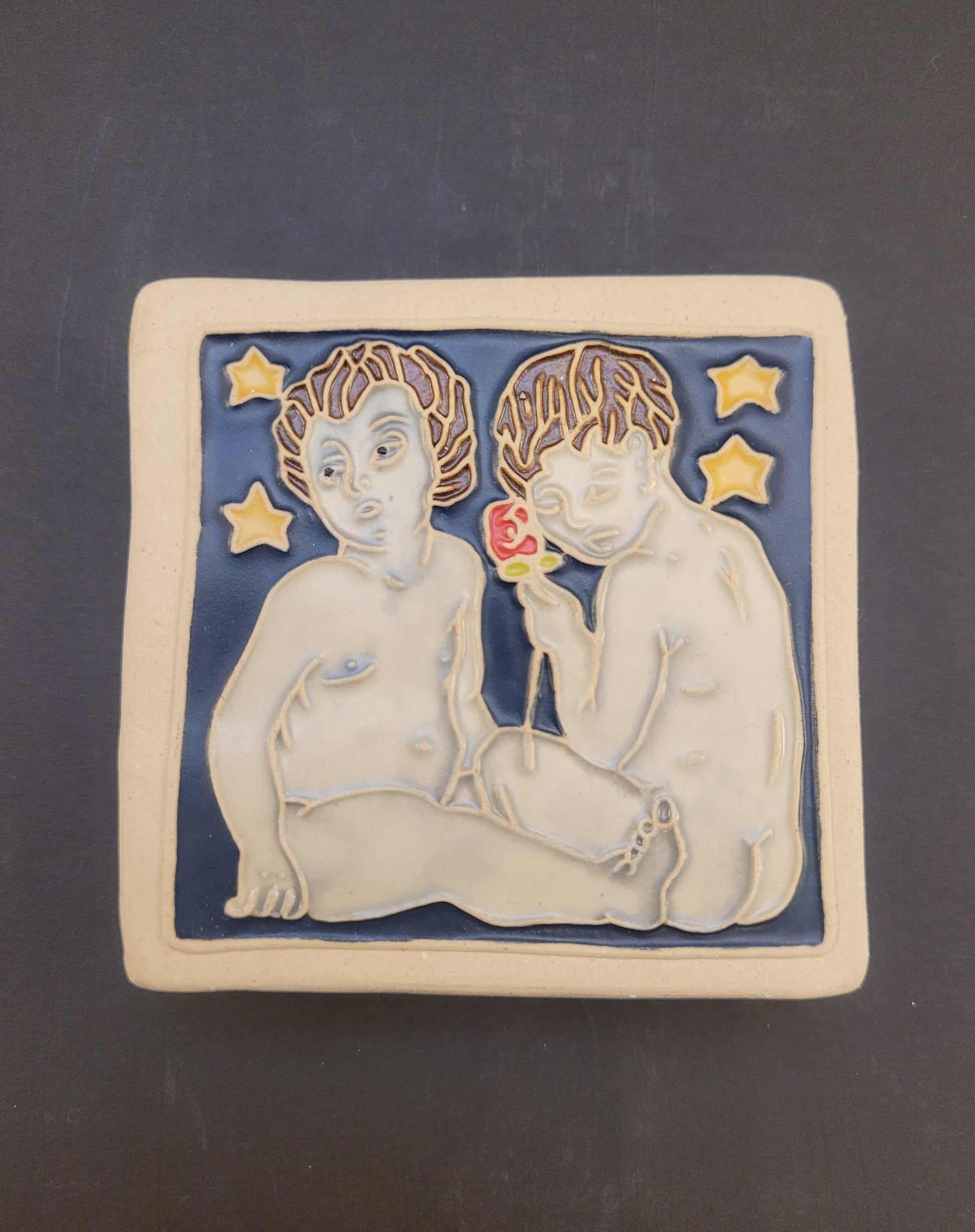 Gemini - This astrology tile is a hand made ceramic tile. The size is roughly 3"x3" and is perfect for being displayed on a wall, or in a custom frame. Each ceramic tile is pressed into an original hand carved mold, and then glazed in a variety of commercial glazes.