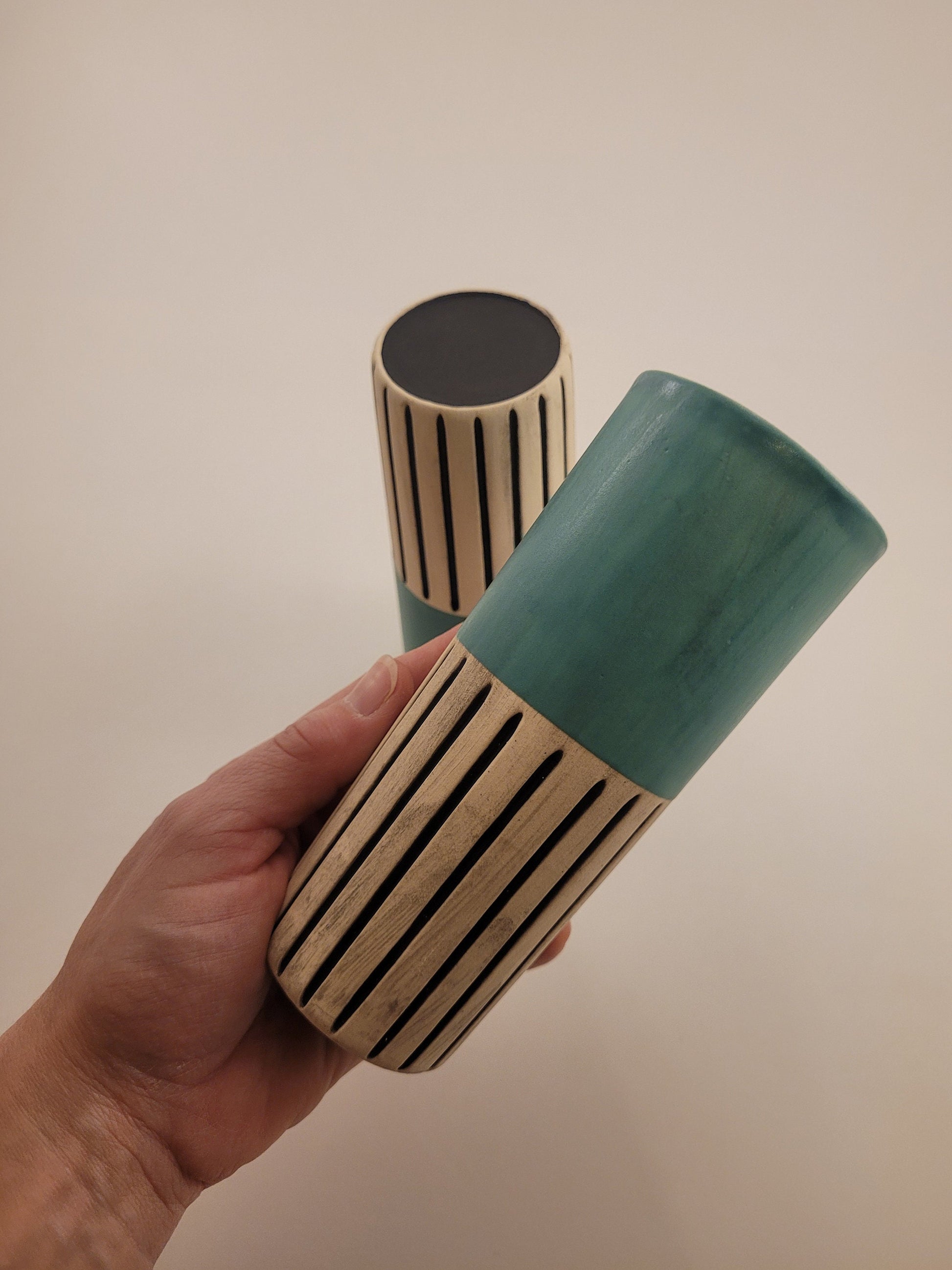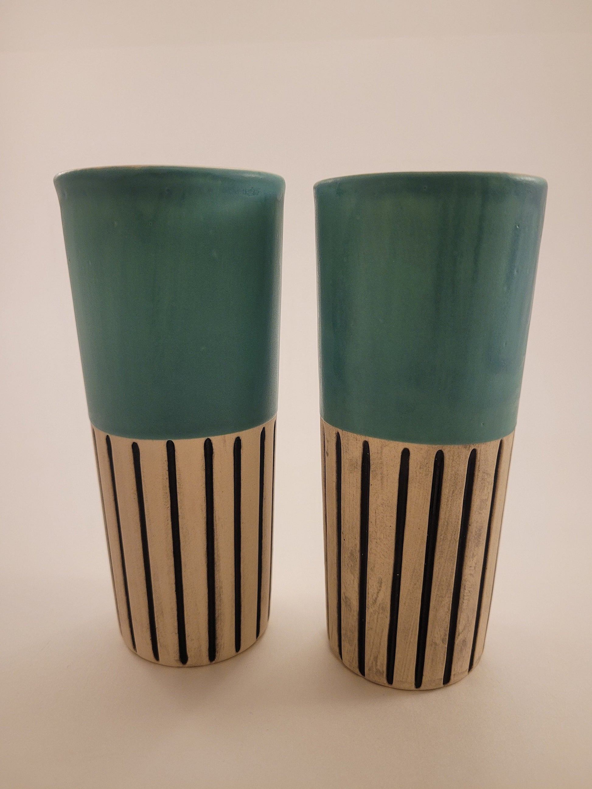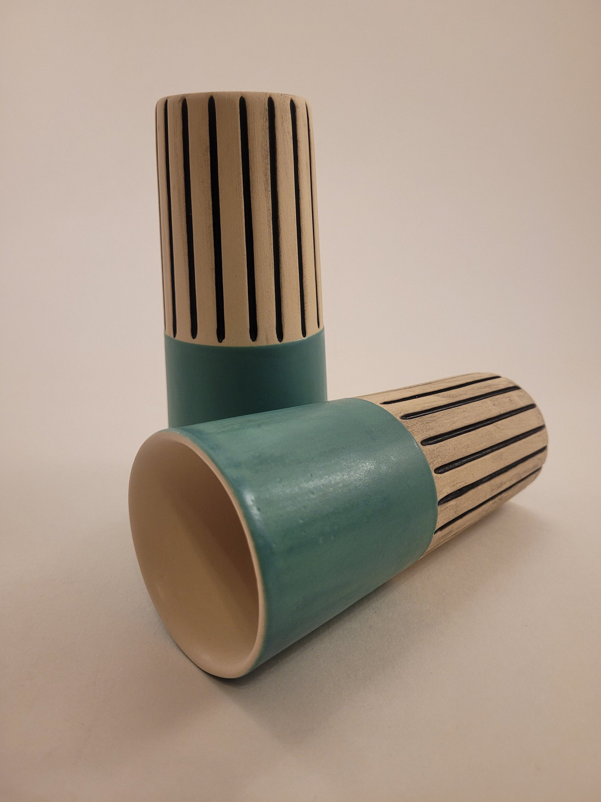 These unique, one of a kind ceramic tumblers are sold in a set of 2. They are slip cast from an original mold made by none other than yours truly π. Once they are set I carve the tumblers, bisque fire...β¦and then glazed fire in beautiful, vibrant glazes (lead free of course!) Perfect for hot or cold beverages. Dishwasher, oven, and microwave safe!