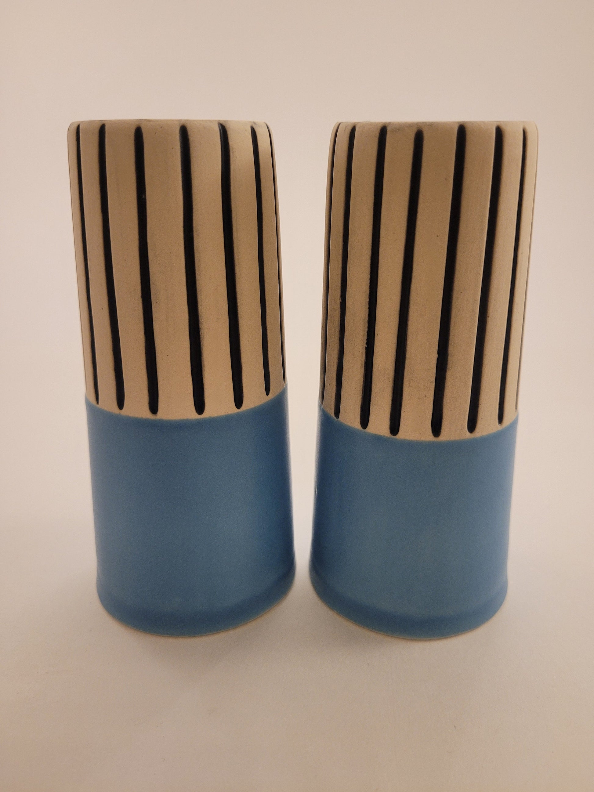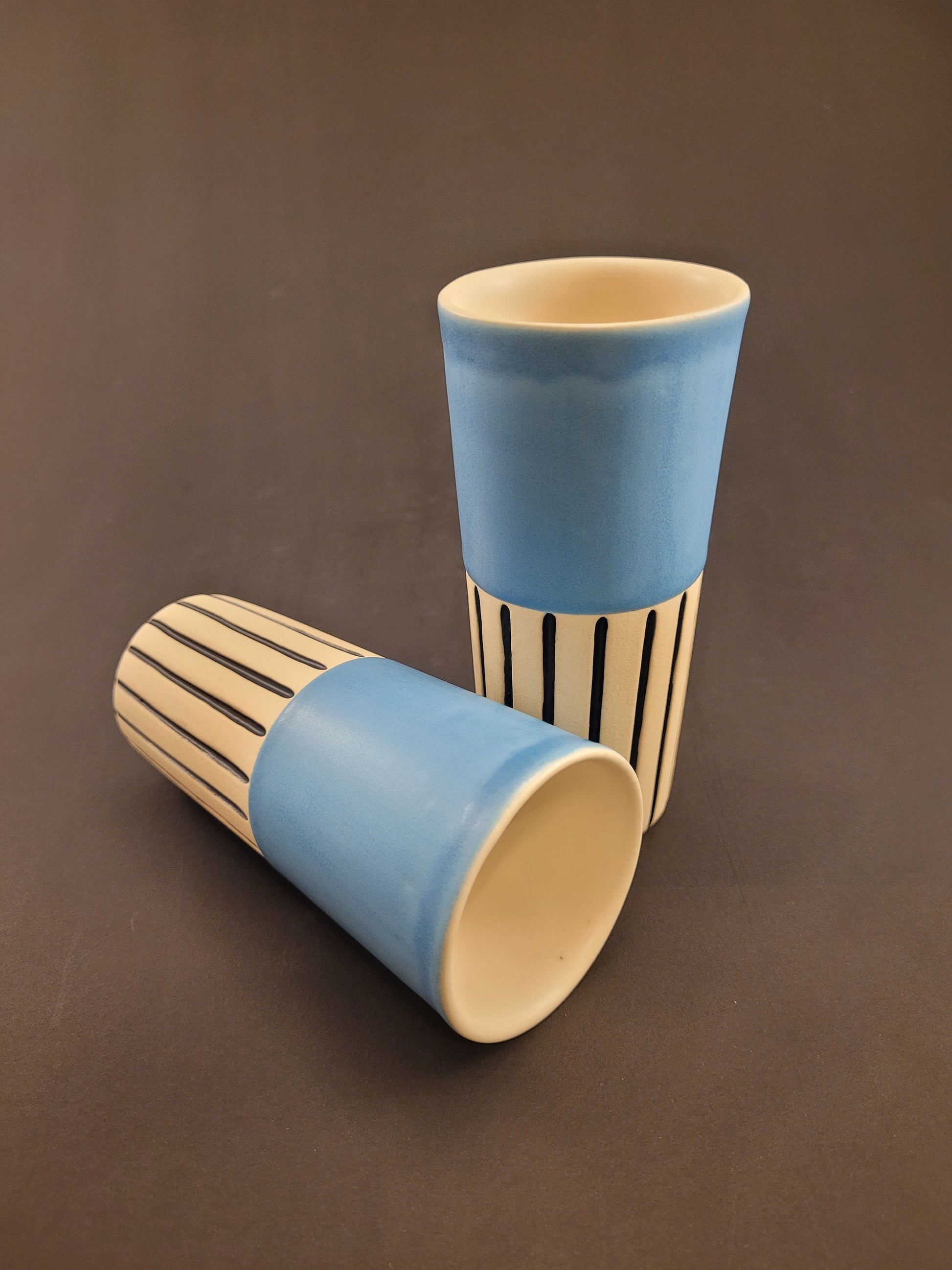 These unique, one of a kind ceramic tumblers are sold in a set of 2. They are slip cast from an original mold made by none other than yours truly π. Once they are set I carve the tumblers, bisque fire...β¦and then glaze fire in beautiful, vibrant glazes (lead free of course!) Perfect for hot or cold beverages. Dishwasher, oven, and microwave safe!