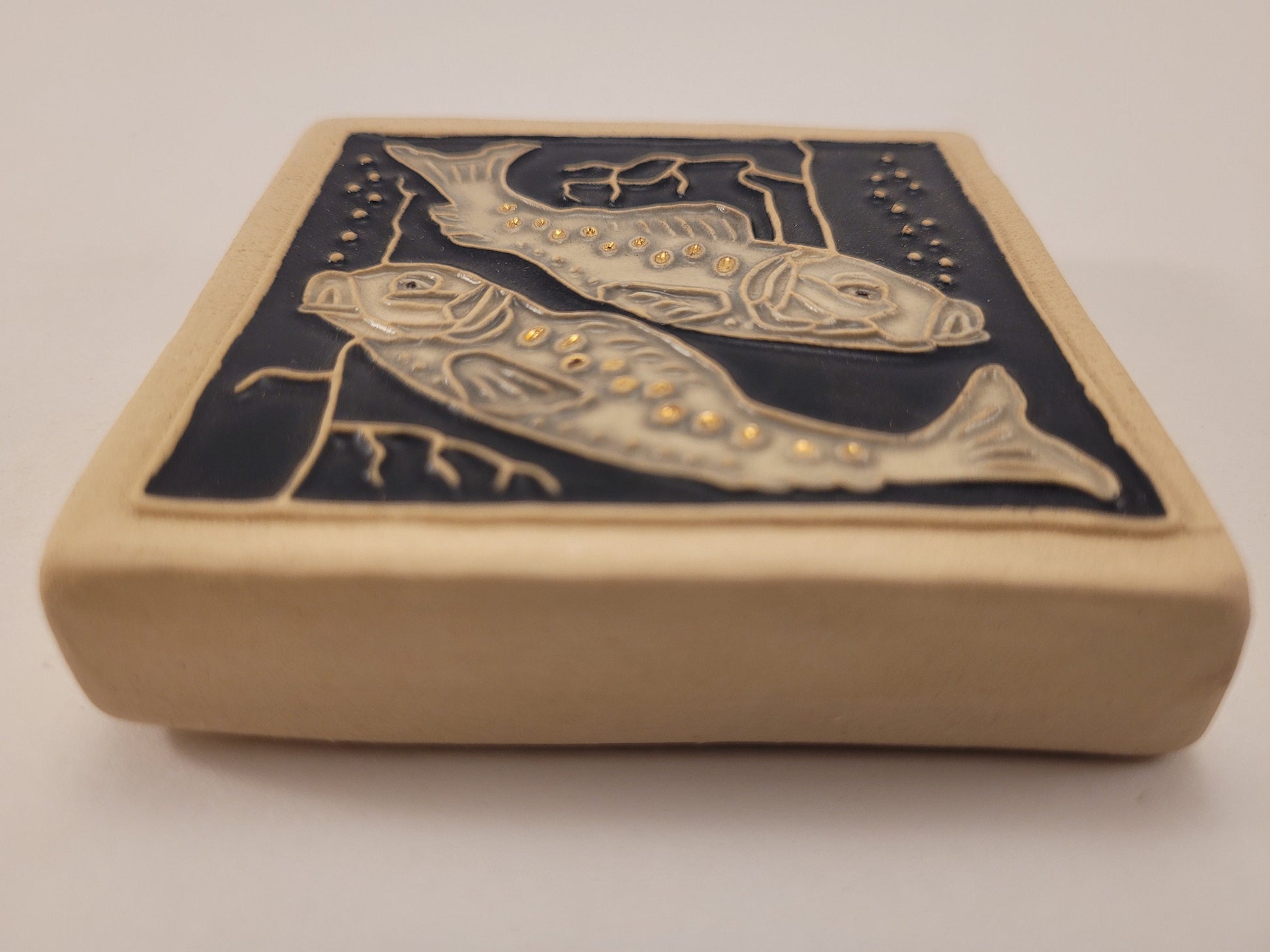 Pisces - This astrology tile is a hand made ceramic tile. The size is roughly 3"x3" and is perfect for being displayed on a wall, or in a custom frame. Each ceramic tile is pressed into an original hand carved mold, and then glazed in a variety of commercial glazes.
