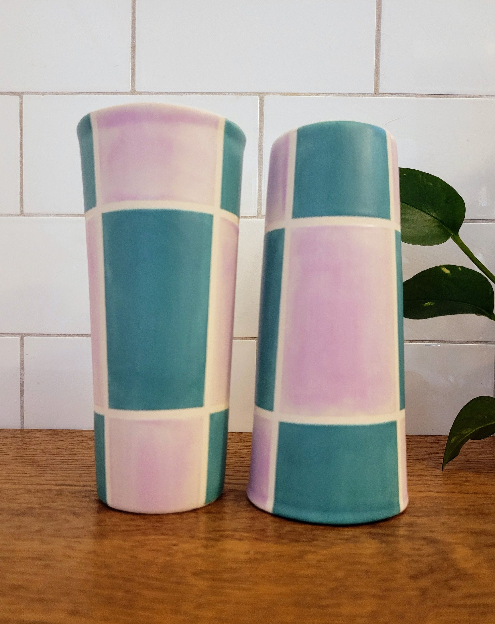 These unique, one of a kind ceramic tumblers are sold in a set of 2. They are slip cast from an original mold made by none other than yours truly π. Once they are set the tumblers are bisque fired...β¦and then glazed in a very Vintage Mod way. All of these beautiful, vibrant glazes are lead free of course! Perfect for hot or cold beverages. Dishwasher, oven, and microwave safe!